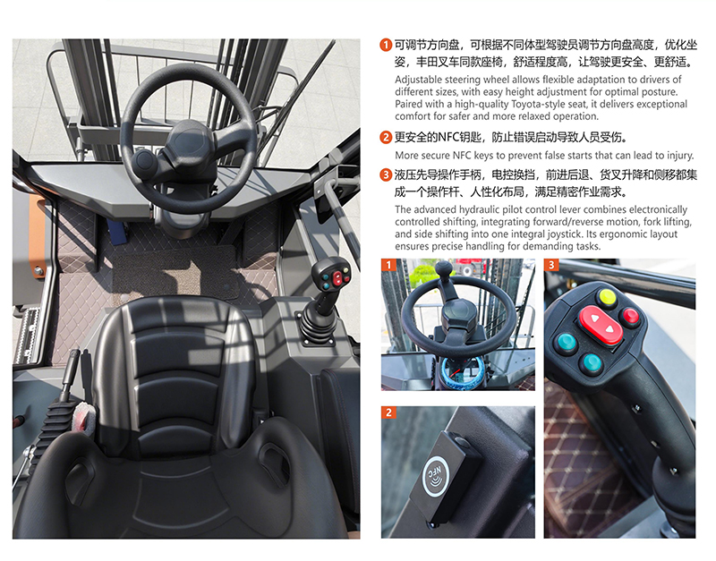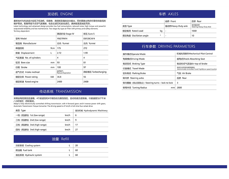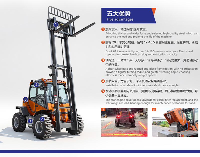 一體式越野叉車(YW35T)為加厚貨叉,精選鋼材提升載重,前輪20.5半實心輪胎,后輪12-16.5真空鋼絲輪胎,后輪轉(zhuǎn)向,承載 力和脫困能力更強,軸距短,一體式車架,無鉸接,轉(zhuǎn)彎半徑小,轉(zhuǎn)向角度大,更適合狹小 空間作業(yè),加裝安全示寬警示燈,保證夜間安全距離作業(yè),發(fā)動機后機蓋可向上開啟,更換濾芯更容易,后方擋泥板承載力強,可 供保養(yǎng)人員站立。